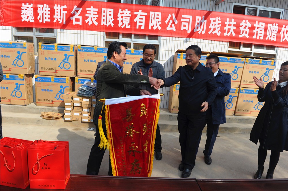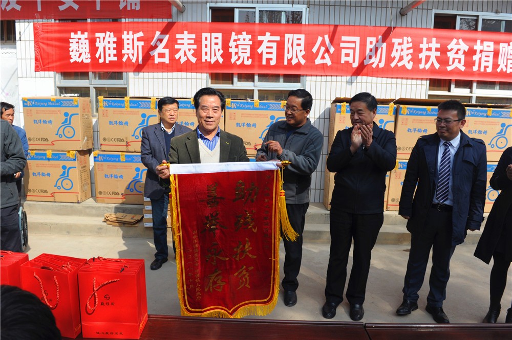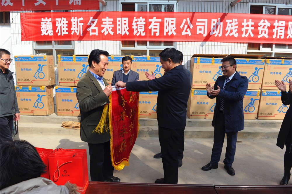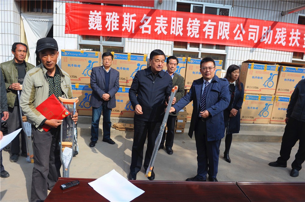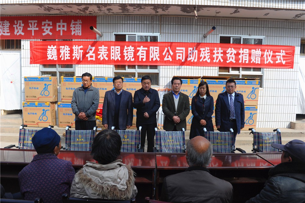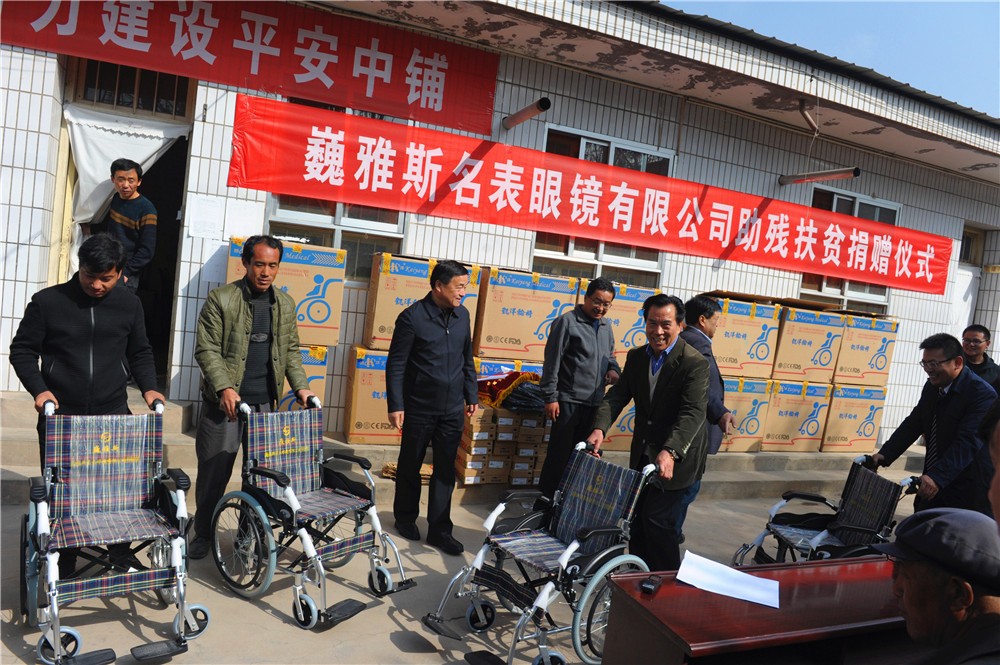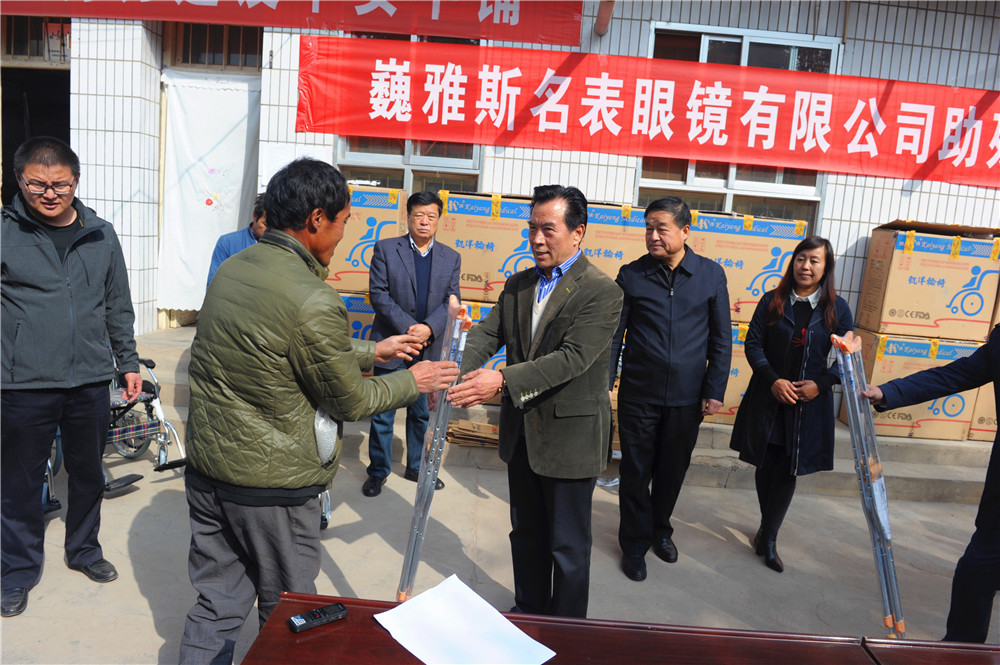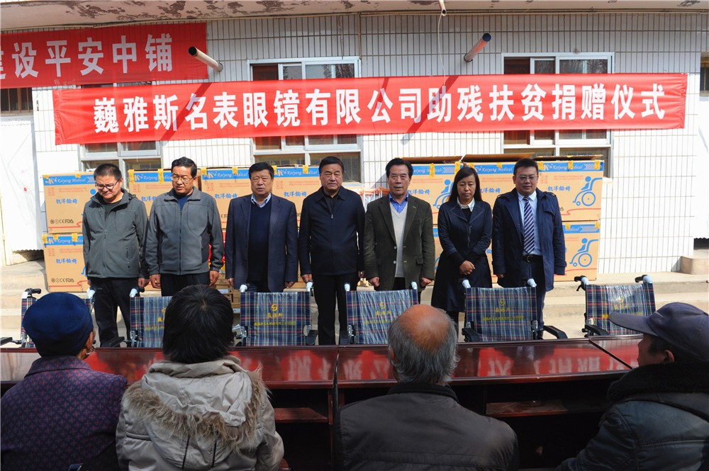 10月24日上午,巍雅斯名表眼鏡有限公司助殘扶貧捐贈儀式在臨洮縣中鋪鎮(zhèn)政府舉行,巍雅斯名表眼鏡有限公司向中鋪鎮(zhèn)殘疾人資助了19100元現(xiàn)金并捐贈了價值11970元的輪椅及拐杖等,希望能夠解決受捐助的殘疾人當(dāng)前的困難。臨洮縣人大常委會主任蔣景林參加捐贈儀式并講話,高度評價了巍雅斯在社會公益慈善事業(yè)常年來所做的努力。