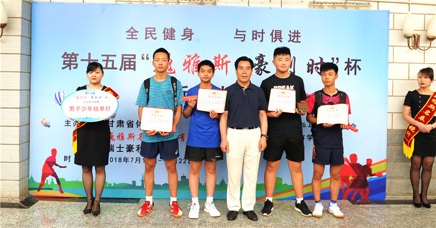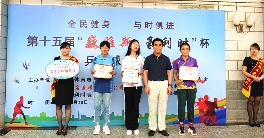 中國鐘表商會副會長、甘肅省眼鏡協(xié)會會長、甘肅省乒協(xié)副會長、巍雅斯名表眼鏡有限公司董事長裴正江、甘肅省乒乓球運(yùn)動協(xié)會會長韓力、原蘭州城市學(xué)院院長王汝鋒、巍雅斯名表眼鏡有限公司副總裁裴明宏、甘肅省乒乓球運(yùn)動協(xié)會秘書長宋建農(nóng)、裁委會主任石振民、夲次大獎賽裁判長關(guān)欣出席頒獎儀式并為獲獎代表隊和運(yùn)動員頒獎。