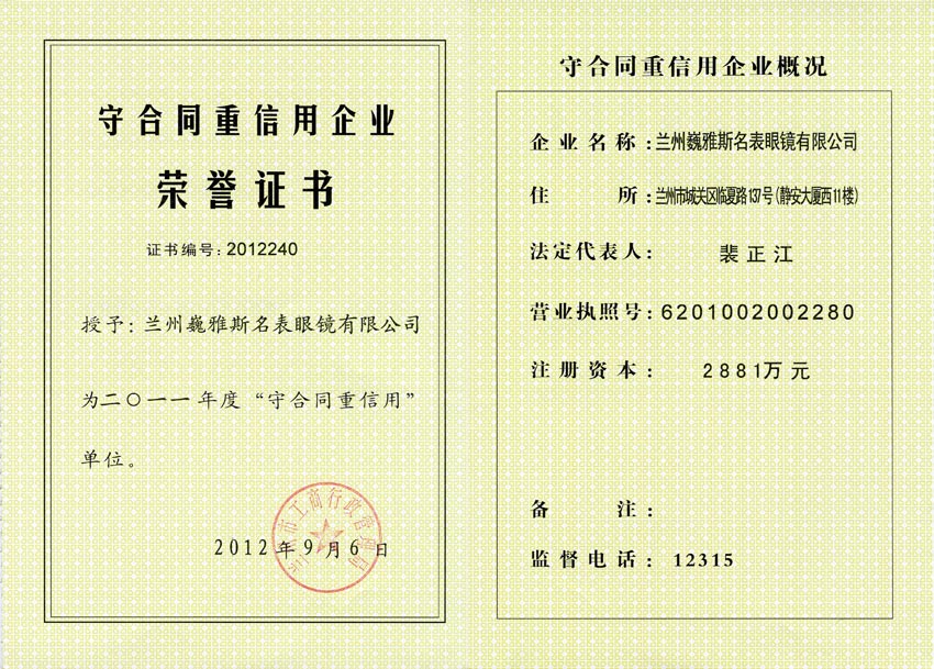 蘭州巍雅斯名表眼鏡有限公司近日被蘭州市工商局授予“守和同重信用企業(yè)”榮譽(yù)稱號(hào),這是蘭州公司繼獲得“誠(chéng)信單位”稱號(hào)后在誠(chéng)信建設(shè)活動(dòng)中獲得的又一殊榮,是對(duì)公司多年來(lái)秉承“誠(chéng)信贏得愛戴”這一理念的積極肯定。多年來(lái),公司根據(jù)自身發(fā)展特點(diǎn),建立適合公司發(fā)展需要的誠(chéng)信建設(shè),在履行合約、產(chǎn)品質(zhì)量、信貸納稅、勞動(dòng)保障等方面加強(qiáng)信用管理,得到了各個(gè)職能部門的肯定和認(rèn)可。