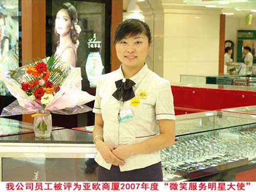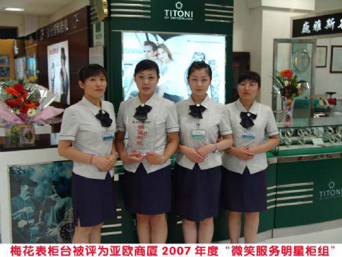 我公司亞歐巍雅斯名表城在亞歐商廈舉辦的2007年度微笑服務(wù)活動(dòng)中獲得多項(xiàng)殊榮.梅花表柜臺(tái)被評(píng)為2007年度微笑服務(wù)明星柜組員工安潔繼2006年被評(píng)為微笑服務(wù)明星,再次被評(píng)為2007年微笑服務(wù)大使.